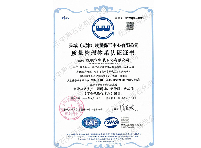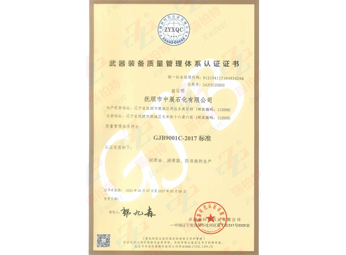 本公司是GB/T19001-2016/ISO 9001:2015標準質量體系認證單位(注冊號:00922Q10664R1S),是GJB9001C-2017標準武器裝備質量管理體系認證單位。撫順在上個世際五十年代就已是我國軍用油脂的生產(chǎn)基地,本公司正在發(fā)揚和繼承這一優(yōu)良傳統(tǒng),全力投入于各種軍用、航空油脂的生產(chǎn)與研發(fā)。